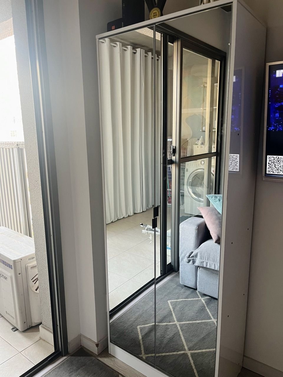 • Espelho Gigante (1,72m): A porta possui um espelho amplo que permite visualizar o look completo antes de sair de casa, dispensando a necessidade de um espelho avulso no quarto.