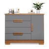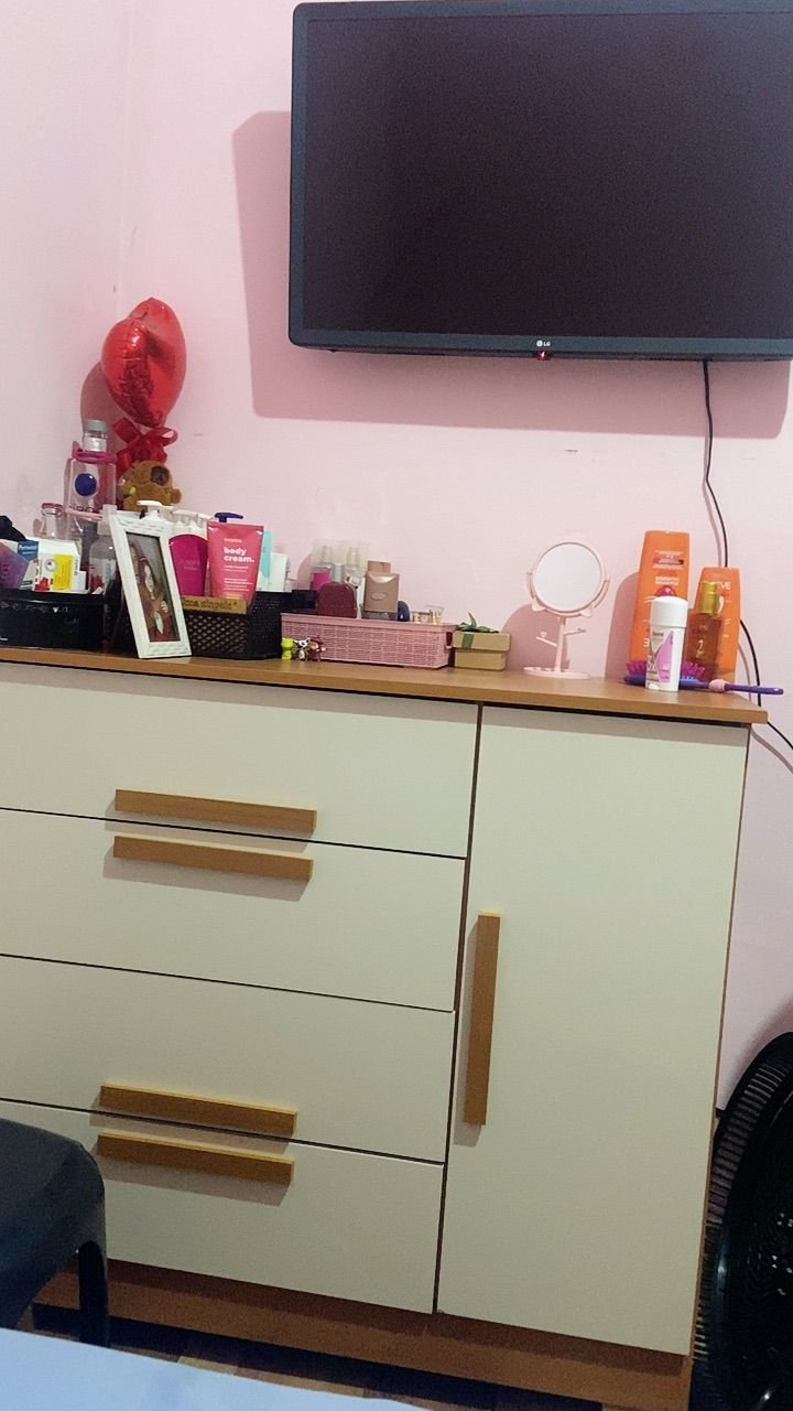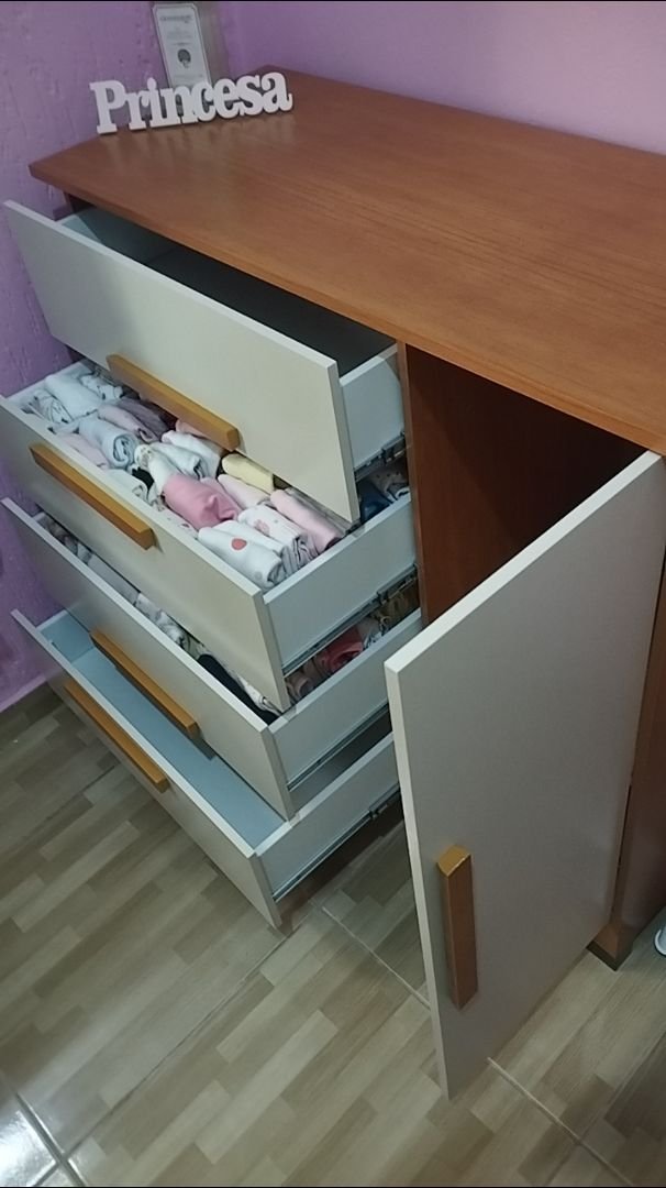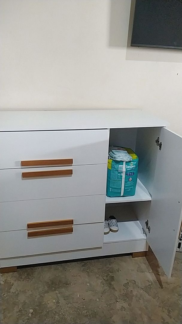 Esta cômoda une o melhor de dois mundos: o espaço de gavetas para roupas e a funcionalidade de uma sapateira lateral com porta. Com quase 1 metro de largura, ela oferece um tampo espaçoso, ideal para apoiar uma TV de até 42 polegadas, montar um cantinho de maquiagem ou usar como trocador no quarto do bebê.
