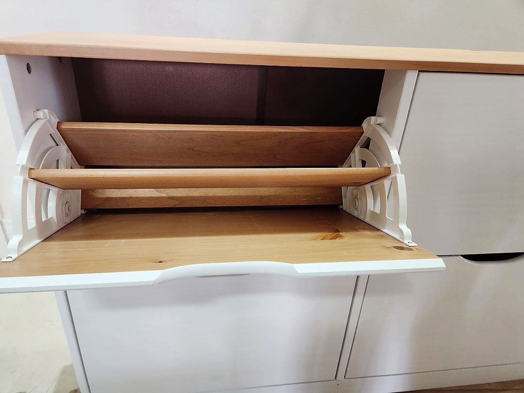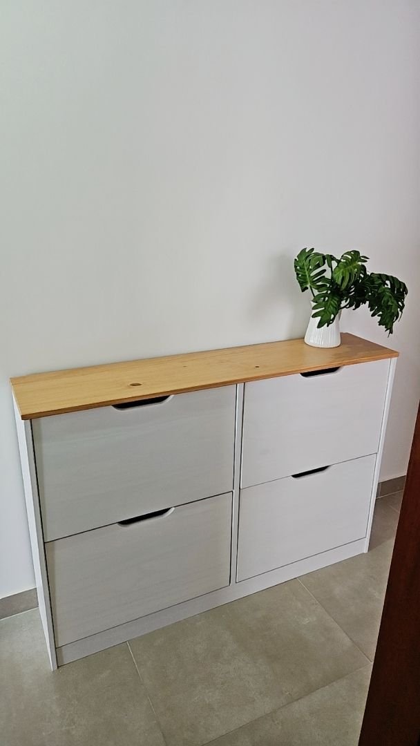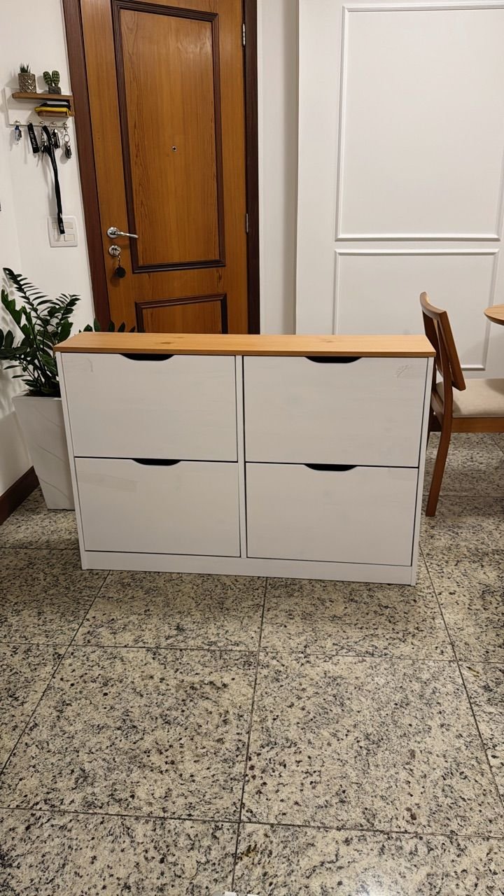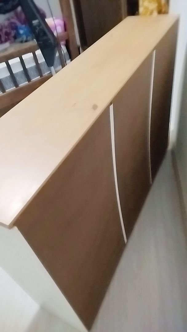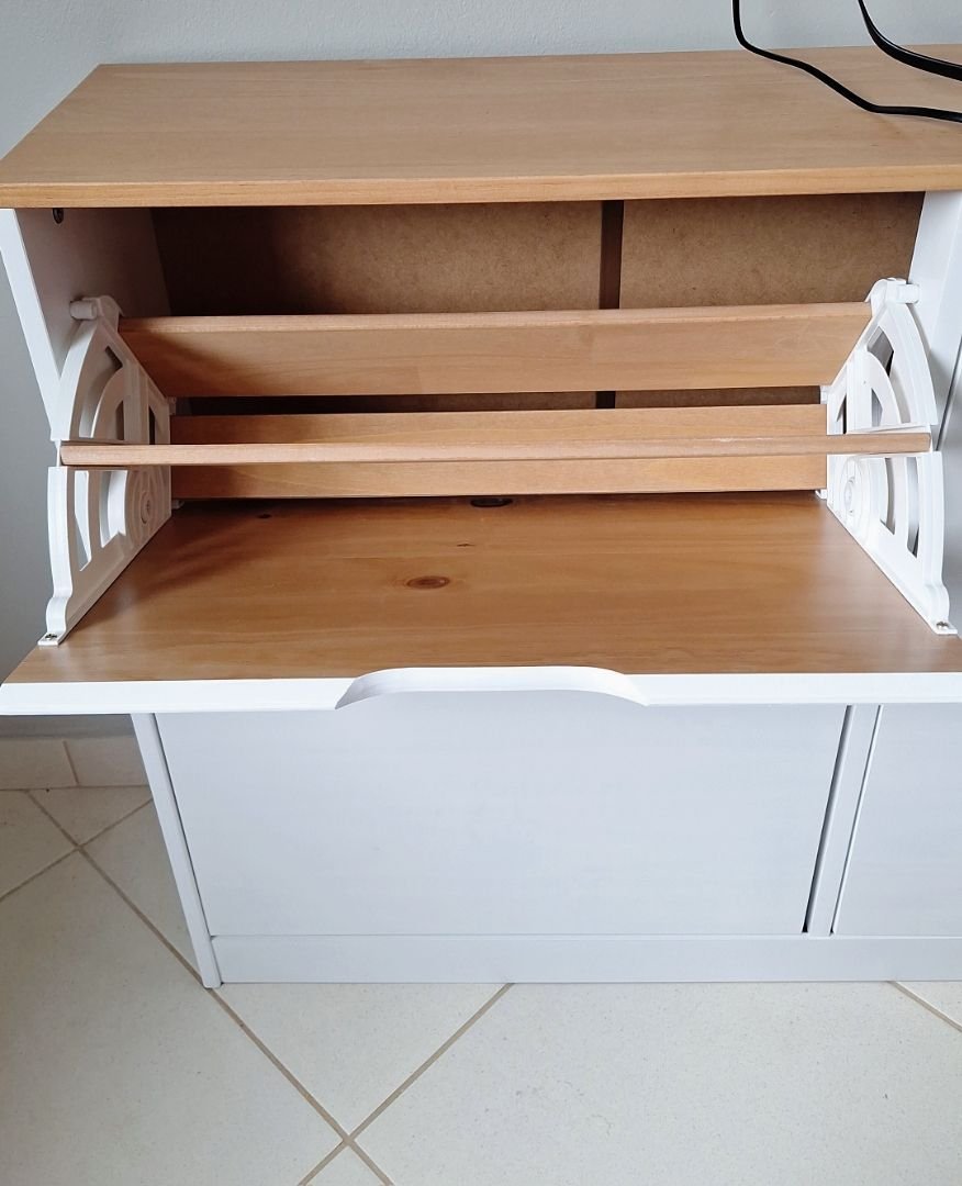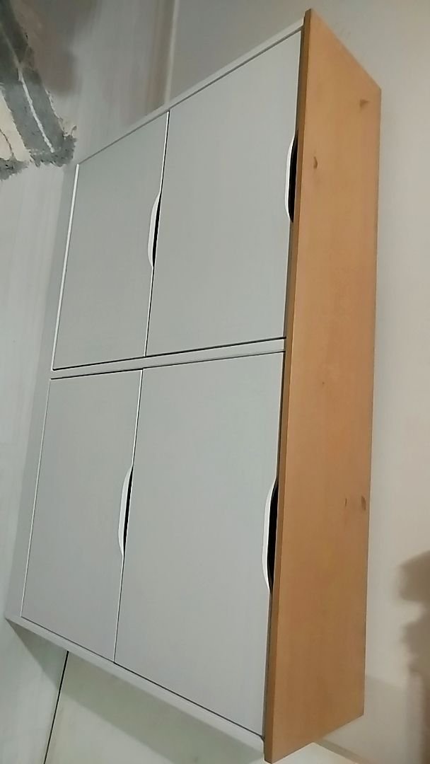 Muito bonita, a pintura é bem leve, pra mostrar os detalhes da madeira, quem não gosta melhor escolher outra cor. As portas abrem facilmente, foi necessário colocar um calço pra evitar. Acho que vou precisar comprar uns imãs pra garantir que não vai abrir.
