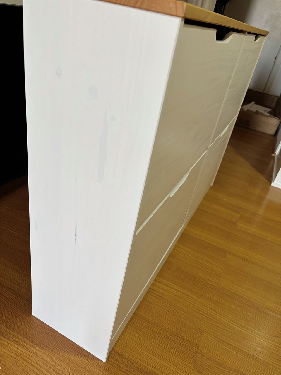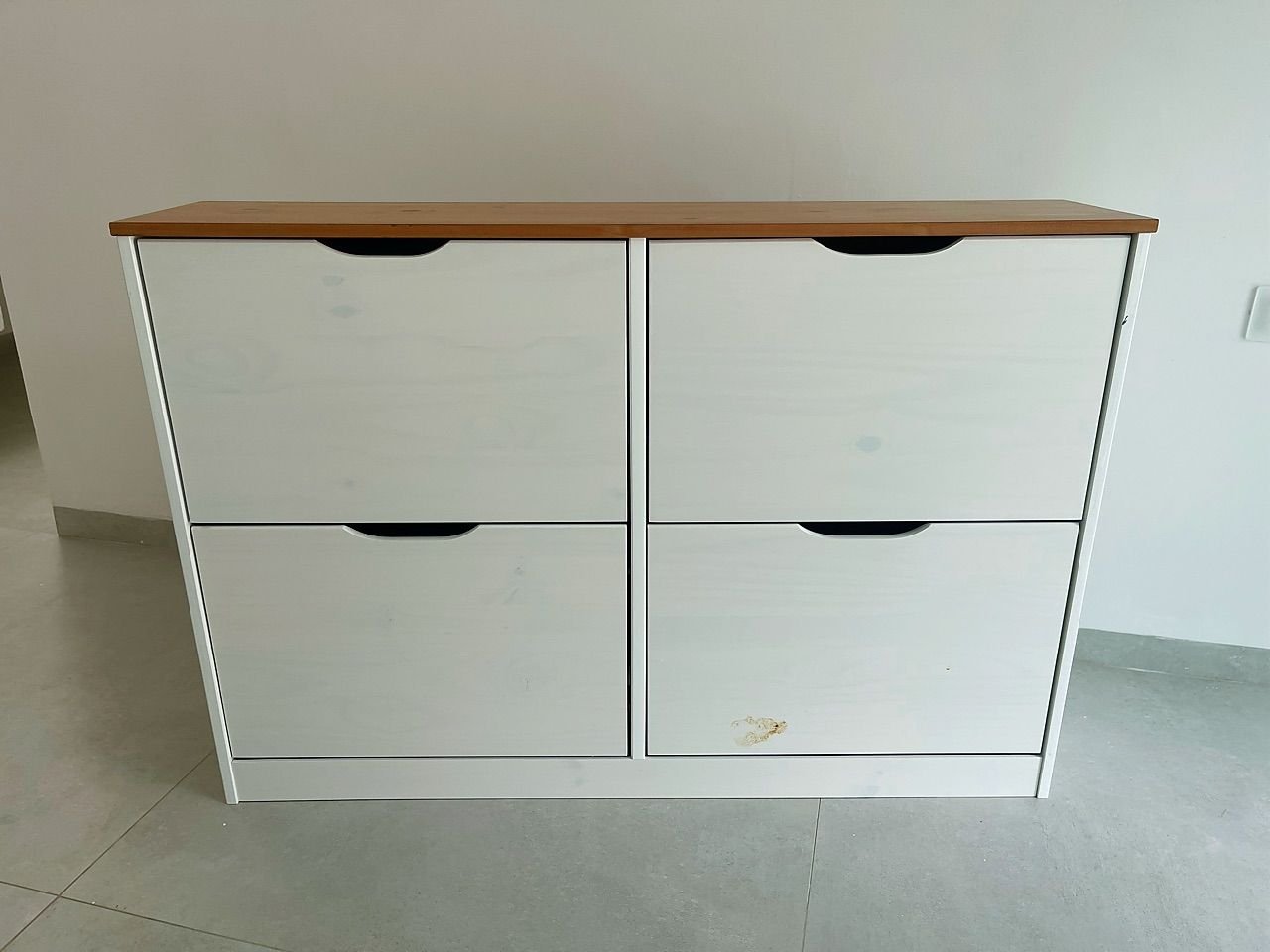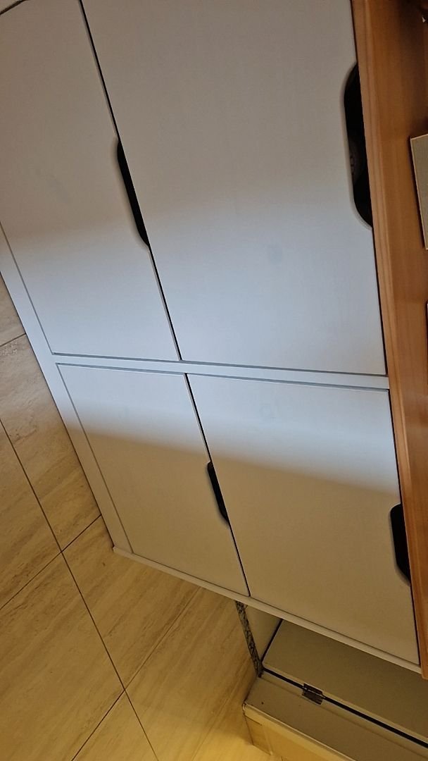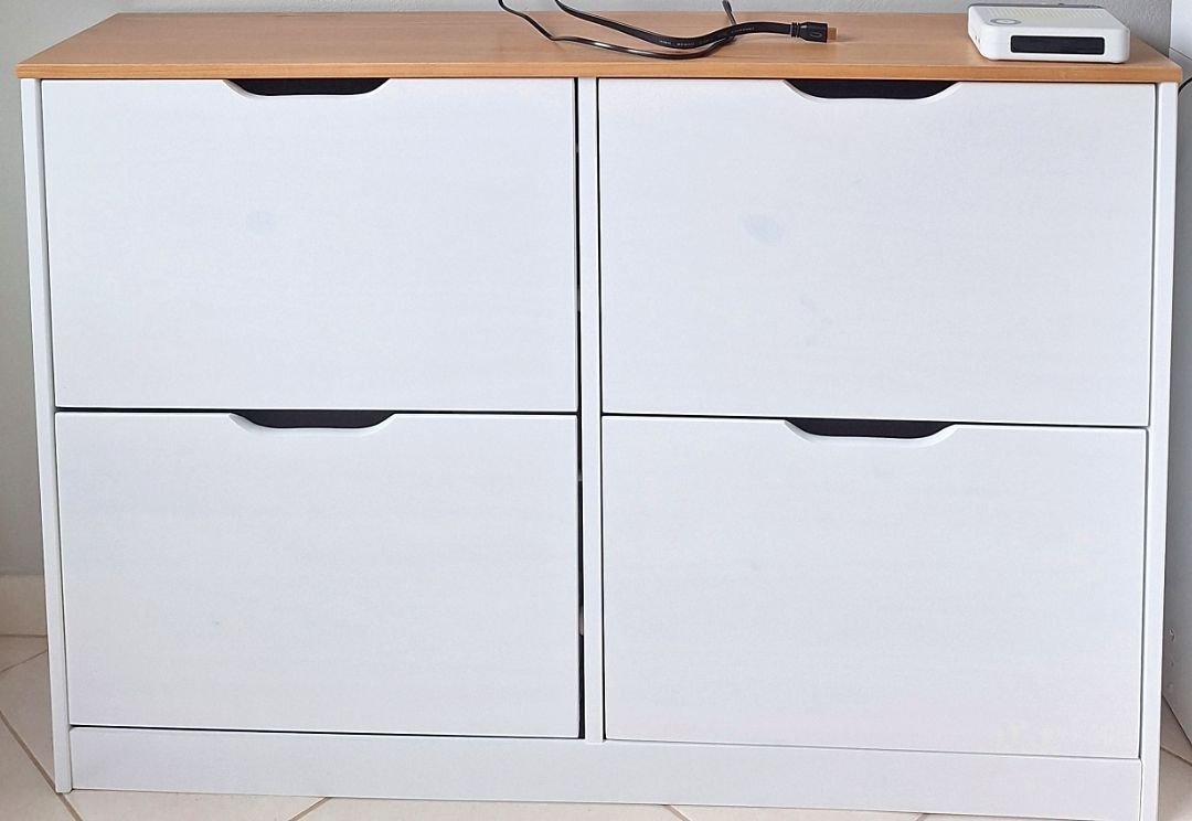 Muito bonita, a pintura é bem leve, pra mostrar os detalhes da madeira, quem não gosta melhor escolher outra cor. As portas abrem facilmente, foi necessário colocar um calço pra evitar. Acho que vou precisar comprar uns imãs pra garantir que não vai abrir.