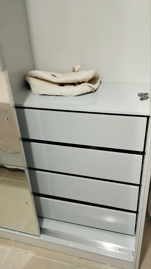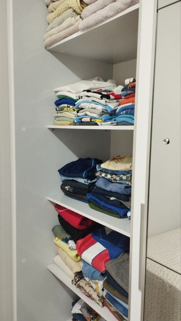 Lado Direito: Coluna de prateleiras para roupas dobradas, sapatos e acesso às 4 gavetas centrais.