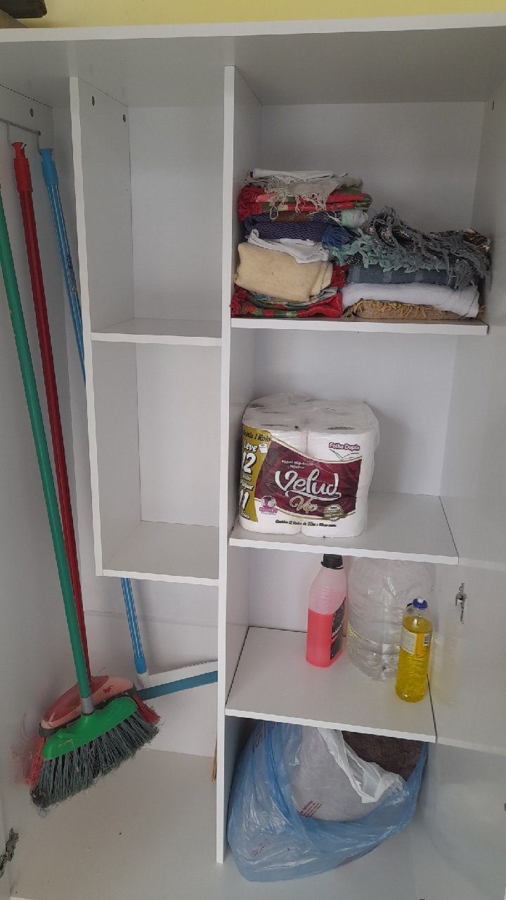 Organizador de Utensílios: Possui suporte interno (cabideiro) para pendurar panos, vassouras ou utensílios, mantendo tudo à mão.